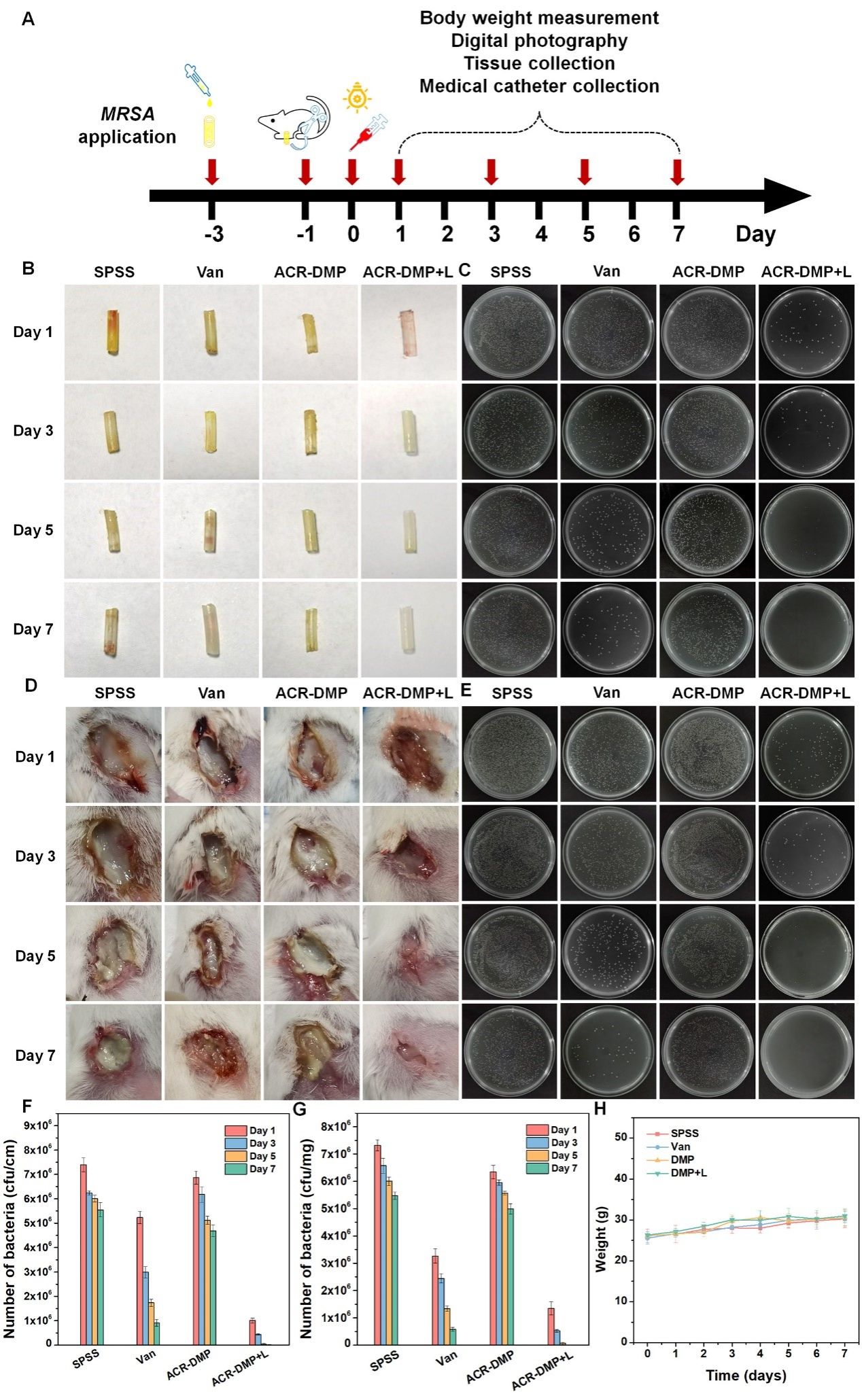 转录组学分析显示(图7),ACR-DMB和ACR-DMP均上调氧化应激相关基因,从而破坏蛋白质合成,同时下调DNA复制、辅因子合成、毒力因子和TCS相关基因。此外,阳离子特性增强了PS的EPS的可穿透性,ACR-DMB和ACR-DMP均上调了渗透压依赖性离子通道的基因,并下调了生物膜形成基因。由于额外的正电荷,ACR-DMB表现出与细胞壁和质膜的更强结合,导致渗透压依赖性离子通道相关的更多基因变化。硼酸修饰为ACR-DMP提供了独特的特性,使其能够下调与QS和多药外排相关的基因,使ACR-DMP能够有效地对抗顽固的生物膜和细菌多药耐药性。