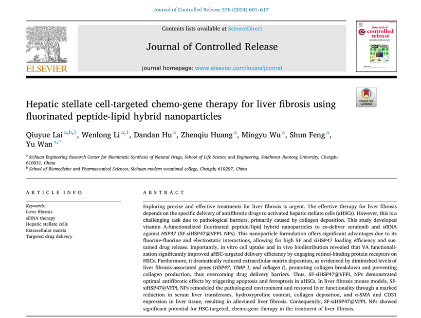 近日,药剂学领域国际顶级学术期刊《Journal of Controlled release》(国际控制释放学会的官方学术杂志,药物递送领域Top期刊,中科院1区TOP期刊,IF=10.5)正式发表9728太阳集团“生命分析技术与材料”实验室的研究成果“Hepatic stellate cell-targeted chemo-gene therapy for liver fibrosis using fluorinated peptide-lipid hybrid nanoparticles”。2021级硕士研究生赖秋月为第一作者,万瑜老师为通讯作者。