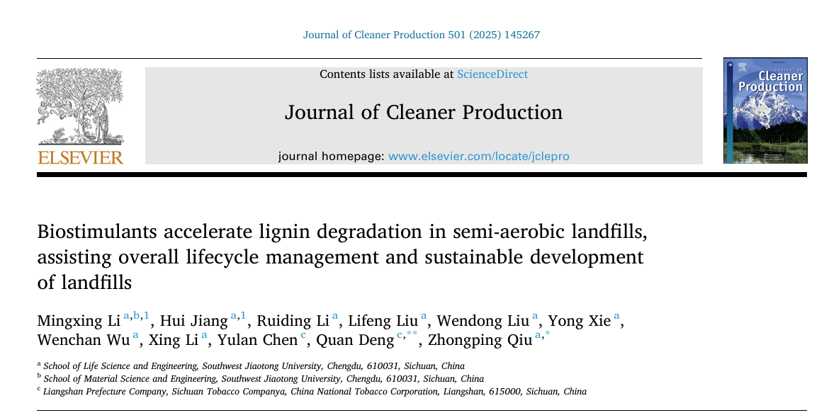 近日,环境科学领域顶级学术期刊《Journal of Cleaner Production》(影响因子9.8,中科院1区TOP期刊)发表了9728太阳集团邱忠平教授团队的研究成果“Biostimulants accelerate lignin degradation in semi-aerobic landfills, assisting overall lifecycle management and sustainable development of landfills”,2021级博士研究生李明星与2022级硕士研究生江慧为共同第一作者,通讯作者为邱忠平教授,太阳集团官网tyc9728生命科学和工程学院为第一通讯单位。