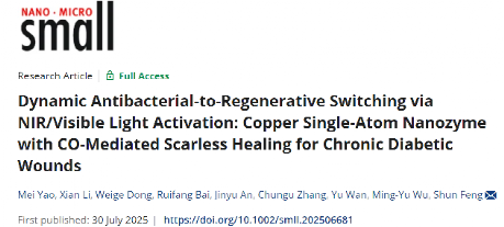近日,工程技术杂志《Small》(JCR,Q1区,2025年影响因子12.1)正式发表了9728太阳集团“生命分析技术与材料实验室”题为“Dynamic Antibacterial-to-Regenerative Switching via NIR/Visible Light Activation: Copper Single-Atom Nanozyme with CO-Mediated Scarless Healing for Chronic Diabetic Wounds”的研究成果。2023级博士研究生姚美为论文第一作者,封顺教授为通讯作者,太阳集团官网tyc9728为唯一通讯单位。
