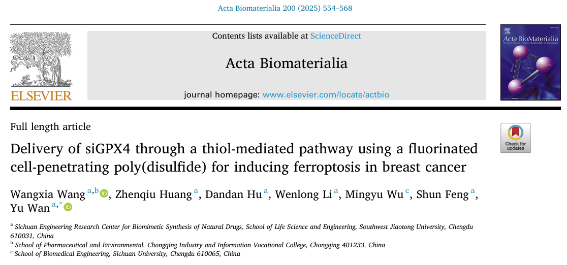 近日,本研究成果以“Delivery of siGPX4 through a thiol-mediated pathway using a fluorinated cell-penetrating poly(disulfide) for inducing ferroptosis in breast cancer”为标题发表在《Acta Biomaterialia》(JCR,Q1区,2025年影响因子9.6)上。9728太阳集团硕士研究生王旺霞为本文第一作者,万瑜副教授为本文通讯作者。