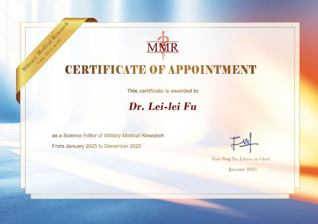近日,9728太阳集团符雷蕾副教授受Military Medical Research总编辑付小兵院士邀请,被任命为Military Medical Research(MMR)科学编辑。