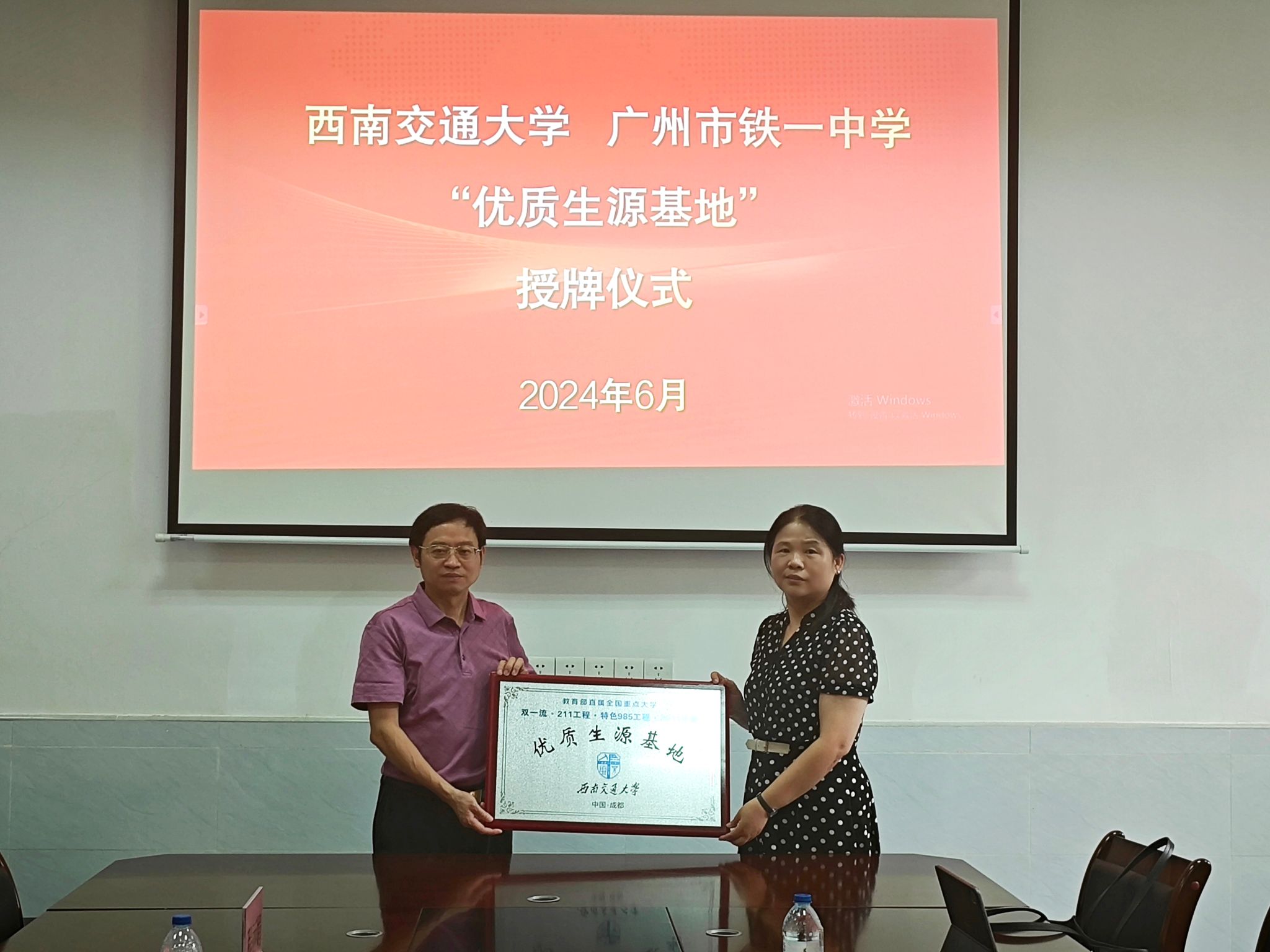 6月23日,生命学院党委书记黄春蓉带队,专业教师徐柳、辅导员许青一行3人前往广州市铁一中学越秀校区、番禺校区进行招生宣传。期间,与广州市铁一中学校长黄连生、办公室副主任程丽娟就学校概况、生源情况、高考情况等开展了座谈交流,并举行了太阳集团官网tyc9728-广州市铁一中学“优质生源基地”挂牌仪式。