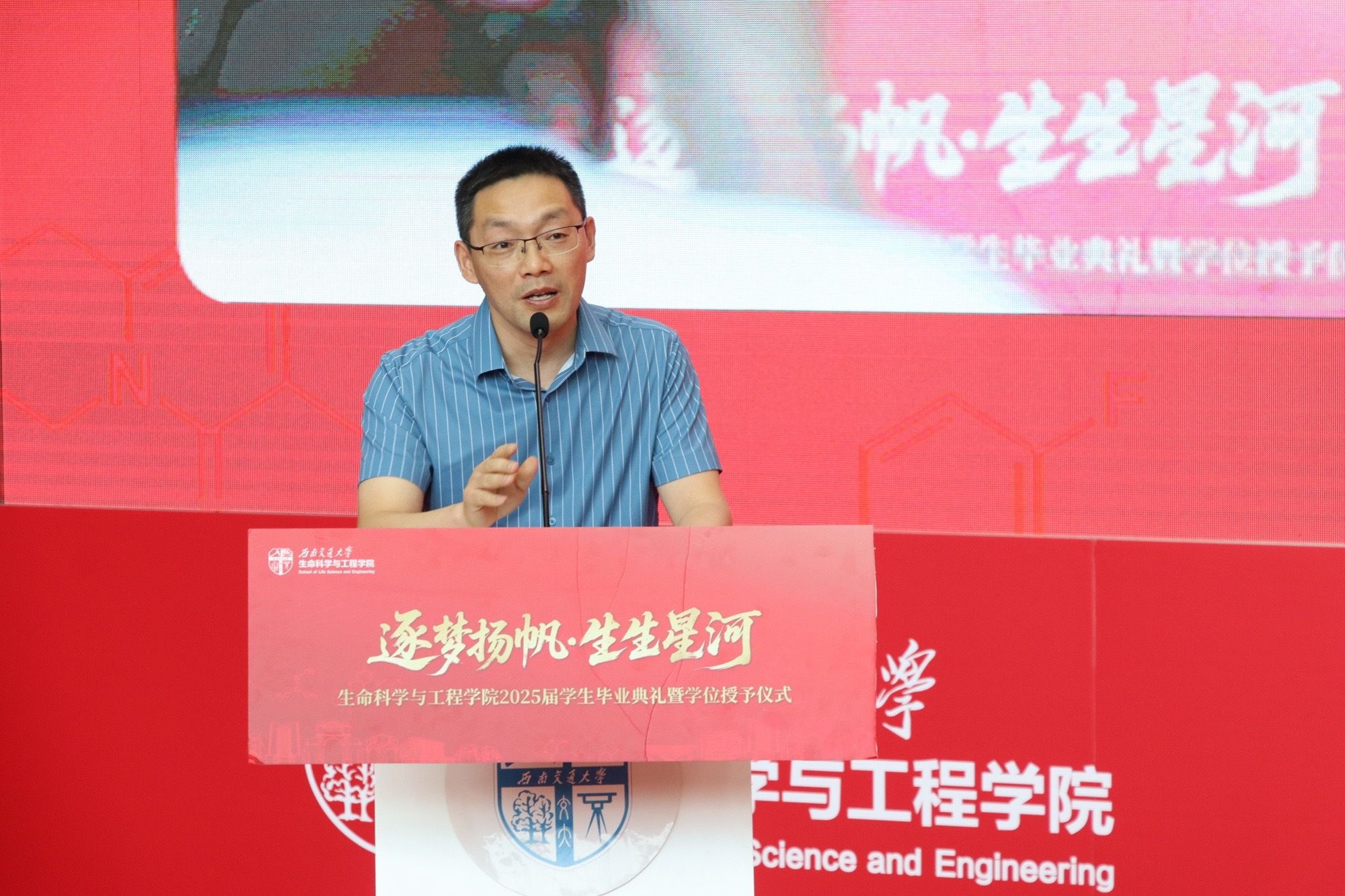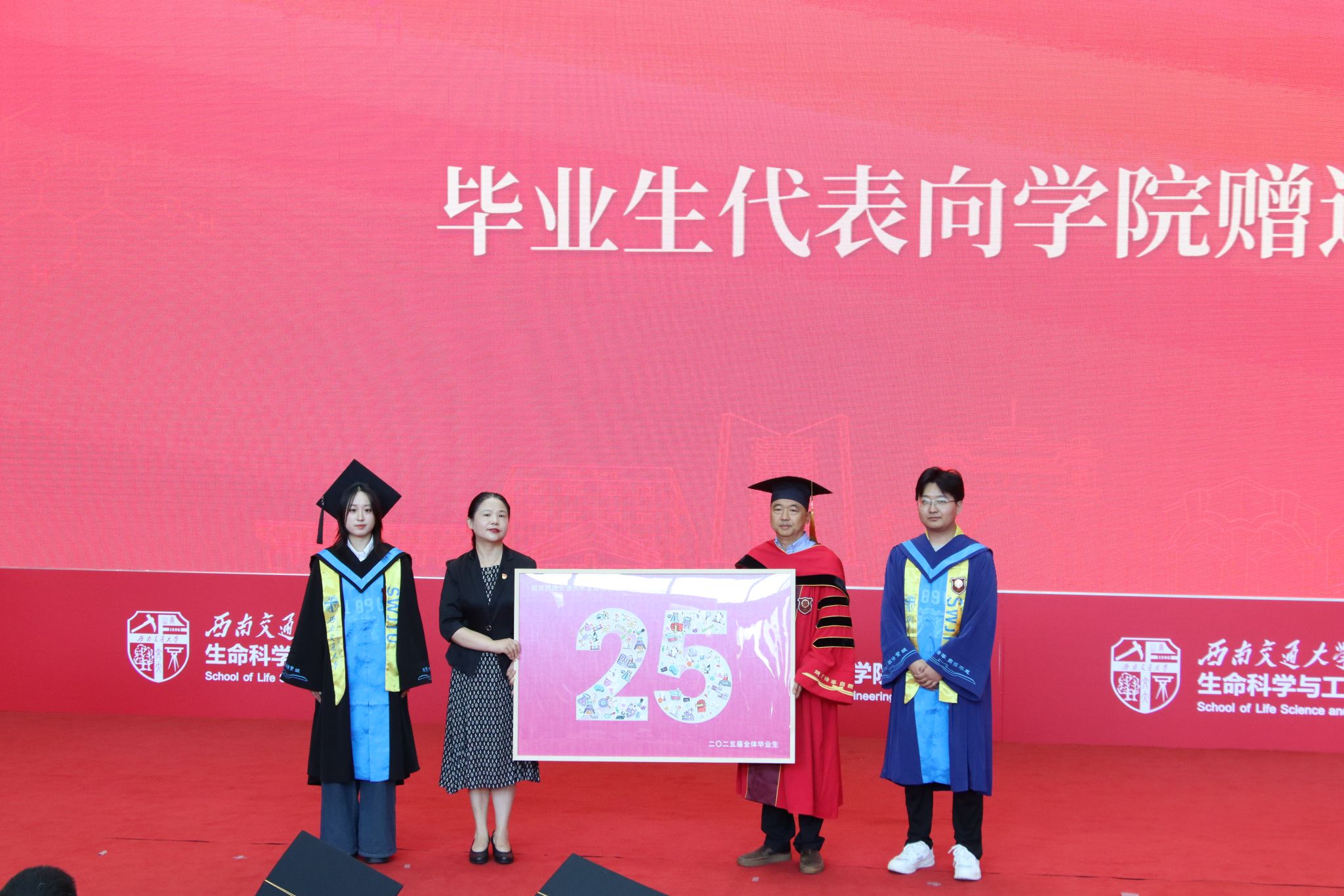 典礼现场洋溢着浓浓的师生情谊。在学院办学25周年之际,学院首届毕业生校友们在祖国各地,通过视频送来祝福。2000级生物工程专业校友代表、成都温江科创中学副校长蔡辉儒在典礼现场分享了自己在生物医药领域的奋斗故事,勉励学弟学妹永葆学习热情,同时珍惜家庭温暖。2025届毕业生则献上精心准备的礼物——由全体毕业生共同拼贴的“25”数字艺术画,庆祝学院办学25周年。
