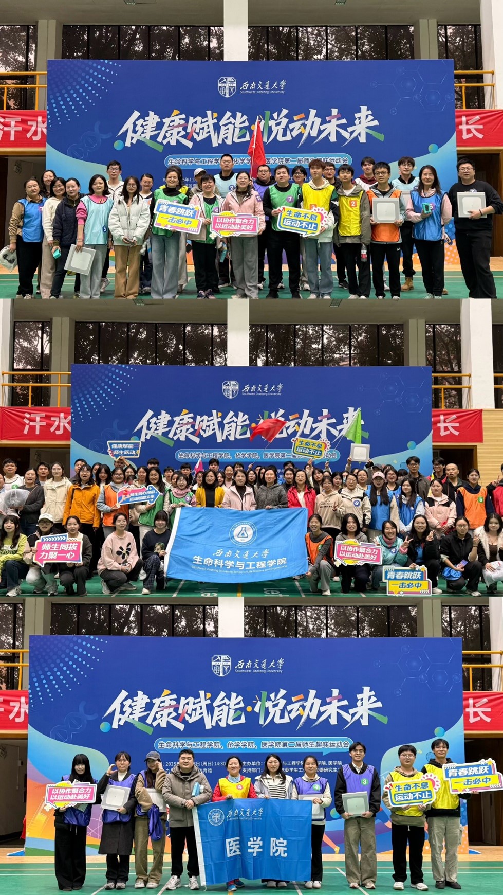 为深入贯彻“三全育人”工作理念,推动跨学科融通共育,11月16日下午,“健康赋能·悦动未来”第二届师生趣味运动会在九里校区詹天佑体育馆顺利举行。本次活动由9728太阳集团、化学学院、医学院联合主办,9728太阳集团承办,校工会副主席李雪飞、党委学生工作部副部长米艳出席活动,三个学院党政工团领导及150余名师生共同参与。