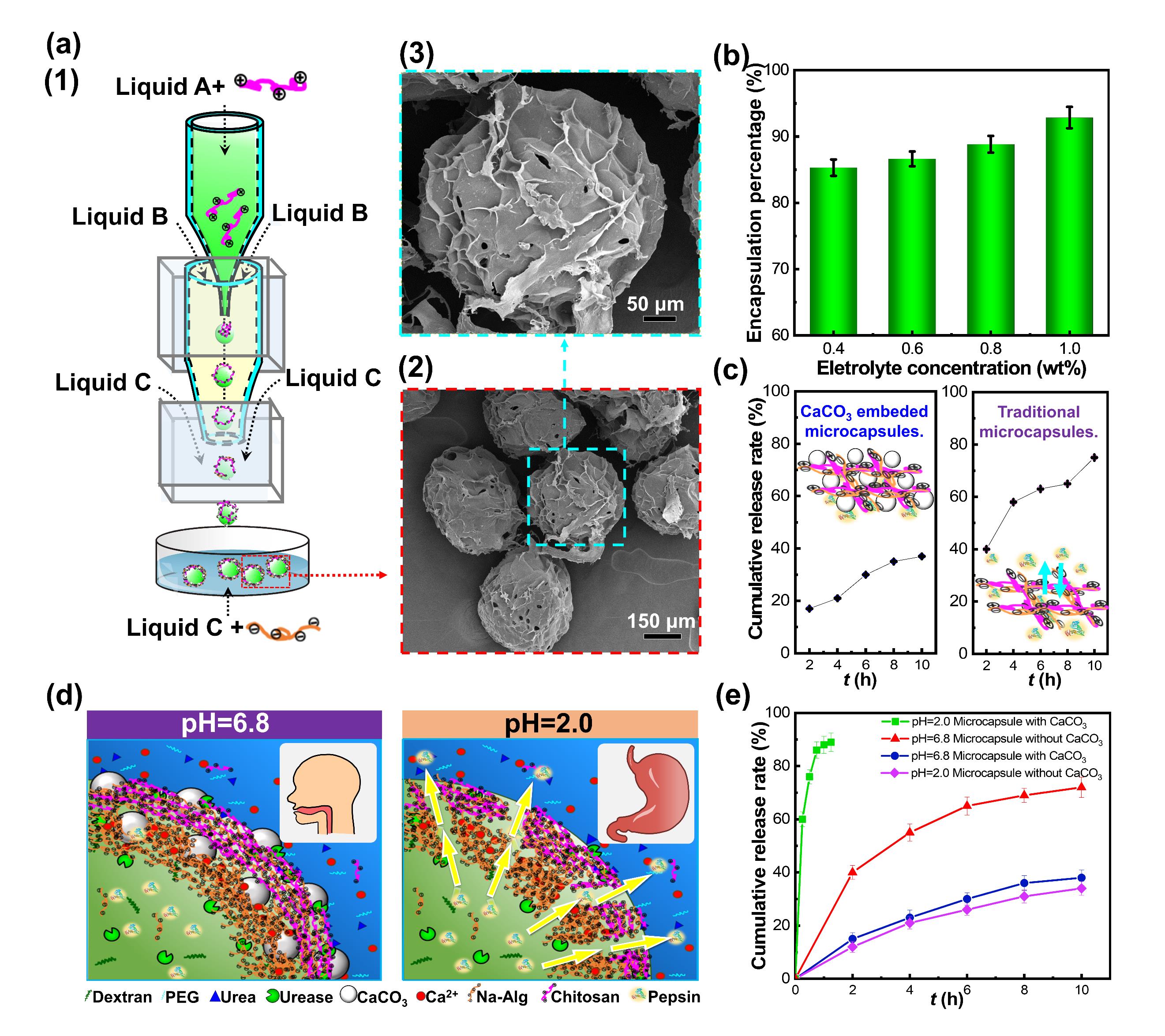 图2 以碳酸钙颗粒稳定的全水隔室为模版构建药物递送微囊及其在生物活性物质包封、酸性环境药物释放的应用。