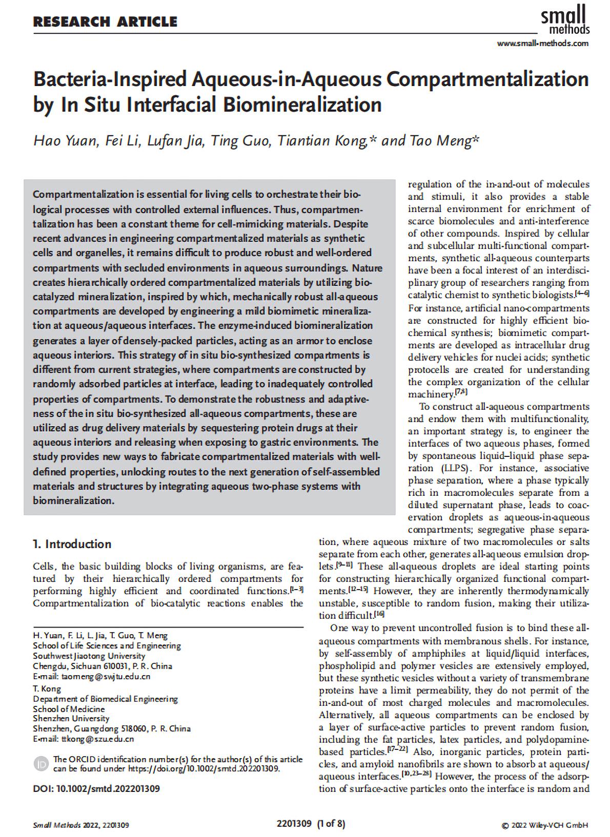 近日,国际生物医学、化学、物理学和材料学领域权威期刊《Small Methods》(影响因子15.367)报道了我校“微纳生物技术”创新团队孟涛教授的研究成果“Bacteria-Inspired Aqueous-in-Aqueous Compartmentalization by In Situ Interfacial Biomineralization”中文译名:“受细菌启发的全水隔室界面原位仿生矿化”(DOI: 10.1002/smtd.202201309)。论文第一作者为9728太阳集团苑昊老师和2018级硕士研究生李飞,通讯作者为深圳大学生物医学工程学院孔湉湉副教授和9728太阳集团孟涛教授,太阳集团官网tyc9728为第一署名单位。