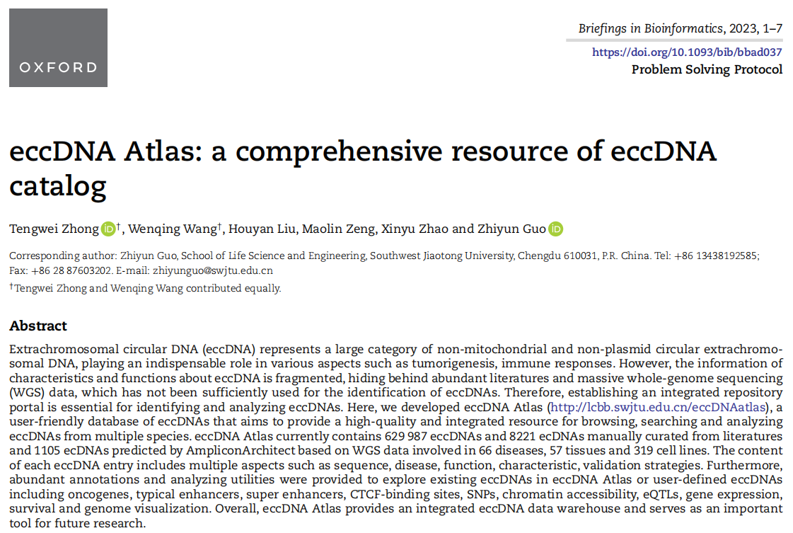 2023-02-15近日,郭志云课题组在生物信息领域TOP期刊Briefings in Bioinformatics在线发表了题为“eccDNA Atlas: a comprehensive resource of eccDN...